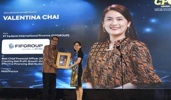 Penghargaan pertama diberikan kepada Direktur FIFGROUP Valentina Chai yang di wakilkan oleh Maria Inawati Bernard, Finance and Treasury Division Head FIFGROUP yang memperoleh apresiasi sebagai Best Chief Financial Officer 2026 for Creating Net Profit Growth through Effective Financing Distribution, kategori Multifinance, dalam Indonesia Best CFO Awards 2026 bertajuk “Leading Finance Transformation in a Digital and Sustainable Era for Long-Term Value”.